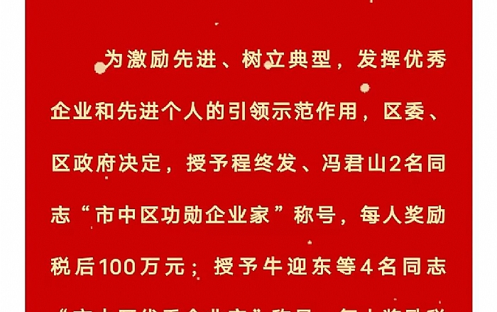 Decision on Commendation of outstanding entrepreneurs and industry leaders of meritorious entrepreneurs in Shizhong District in 2022 (nomination Award)